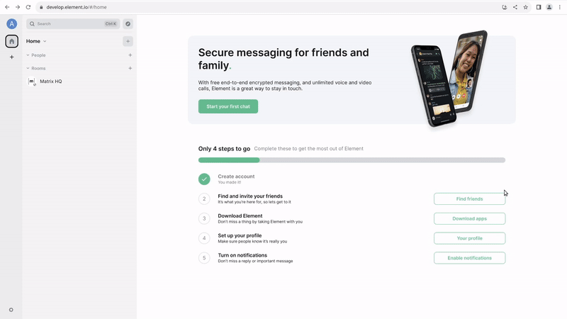 • In upcoming releases we’re also looking at how to improve a user’s first few days in Element. We know that it can be daunting to stare at an empty screen and wonder how to get going, which is why we’ve designed and built a checklist for new users. This checklist will help them to get off the ground and messaging friends in no time.